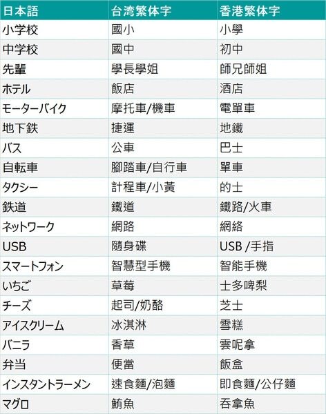 台湾向け繁体字と香港向け繁体字でそれぞれ異なる言葉をいくつかあげてみました。