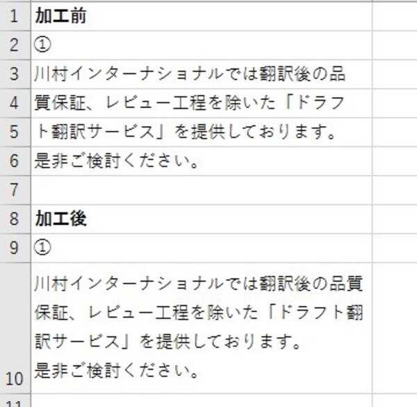 上の画像の「加工前」を見てみると、前述したWordファイルと同様に、見た目を重視した結果、文が4つのセルに別れて表示されていることが分かります。このような場合も、CATツールでは、1つの文が4つの文節に分かれて認識されてしまいます。そのため、分割されたセル内のテキストを1つのセルにまとめる必要があります。