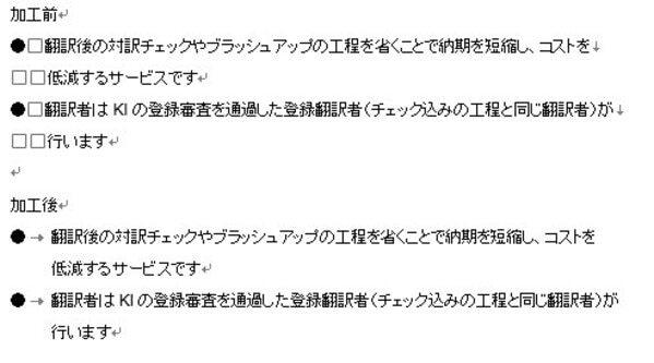 加工前の箇条書きでは、強制改行(↓)と全角スペース(□)を使い、見た目だけを整えていることがわかります。