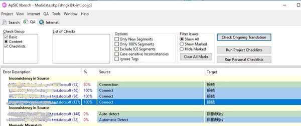 XbenchのQA機能を使用することで、1. 訳抜け(セグメント単位)、3. 指示違反、7.タグの不整合のエラーを検出できます。さらに、XbenchのChecklist Managerを使用すれば、TradosのQA Checkerと同じようにプロジェクトに特化したスタイルエラー、用語エラー、特別なルールなども詳細に検出することができます。