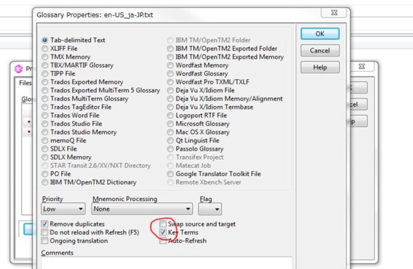 1. 翻訳ファイルを取り込んだ後に(上記「基本的な操作方法①」の続きで)、同様に該当の用語集をドラッグ&ドロップする  ※用語集の形式はタブで区切られたtxtファイル、カラムで分けられたexcelファイル、もしくはバイリンガル形式のファイルであればOK