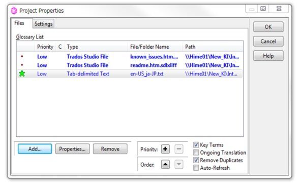 バイリンガルファイルと用語集を読み込むと、取り込んだファイルが以下のように表示されます。
