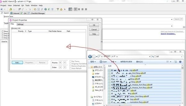 2.  取り込みたい翻訳ファイルを図のようにドラッグ&ドロップ(今回はTradosのバイリンガルファイルを取り込みます)
