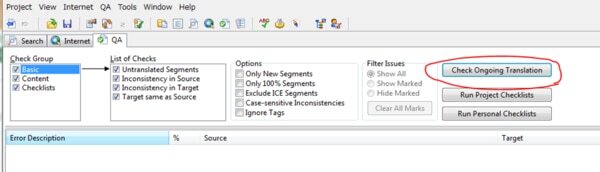 [QA]タブに移動し、任意の項目にチェックマークをつけ、[Check Ongoing Translation]ボタンを押すと、検出されたエラー一覧がメインの画面にリストされます。用語集を取り込んだ場合は、用語違反のエラーもここに一緒に表示されます。