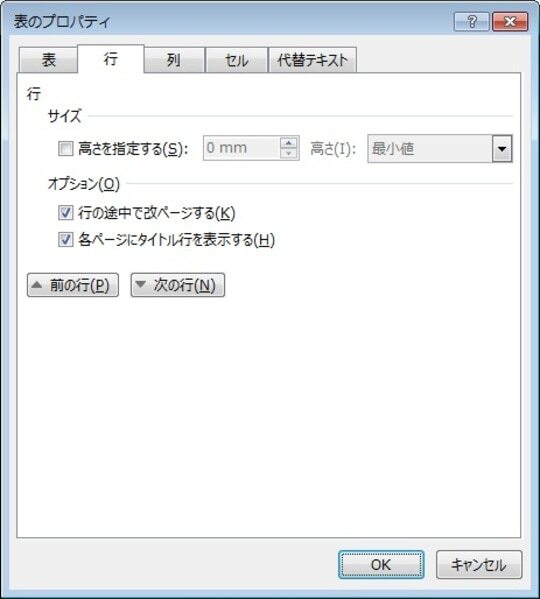 表タイトルとなる部分(上の画像の表の場合、青い行)を選択し、右クリックで[表のプロパティ]を出します。[行]タブに「各ページにタイトル行を表示する」というオプションがあるので、こちらにチェックをいれます。