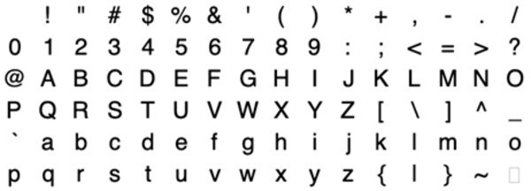現在使用されている文字コードの元祖となっているASCII(American Standard Code for Information Interchange)では、1バイトの半分(7ビット)すなわち128文字分を使用して、20のスペースから7Eのチルダまで、英数字と記号を併せ95文字に番号を振っています。