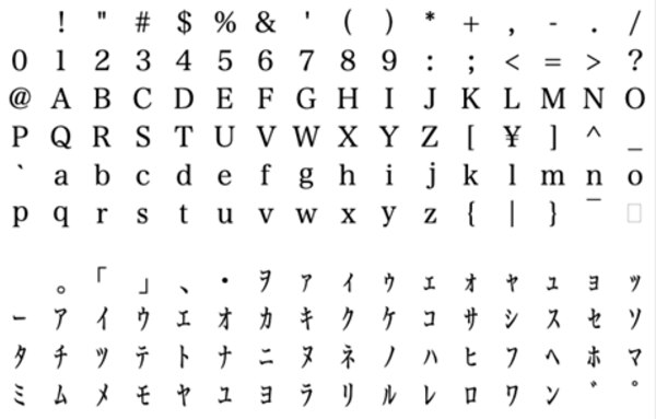 日本語の1文字を1バイトで表す文字コードもいくつかありますが、その中に、1969年に制定されたJIS X 0201があります。前半128文字分はASCIIとほぼ同じであり、後半128文字分でカタカナと記号が定義されています。