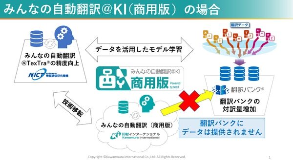 「みんなの自動翻訳@KI(商用版)」は、利用者の許可なくデータが「翻訳バンク®」に提供されることは決してございません。