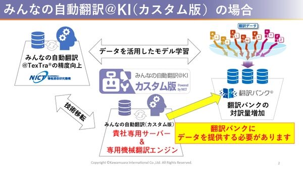 一方、「みんなの自動翻訳@KI(カスタム版)」は「翻訳バンク®」にデータを提供して、オール・ジャパンの枠組みに協力することを前提に、自社向けの自動翻訳エンジンを構築できるテイラーメイドのサービスです。