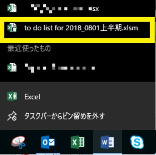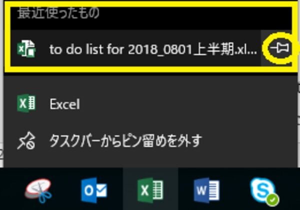 この機能は、ソフトウェアだけでなくよく使うエクセルファイル、Wordファイル、Windows エクスプローラー、ウェブサイトなど特定のファイル・場所の保存にも使用できます。よく使用するファイルは、タスクバーで該当のソフトのアイコンを右クリックすると、下のようにタスクバーの上に「最近使ったもの」として表示されます。これを右クリックすると、先ほどと同様にピンマークが表示され、「一覧にピン留めする」が表示されます。