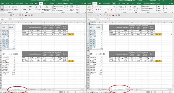 これは同様にエクセルでも可能です。下のように同じファイルの別のシートを同時に比較することができます。