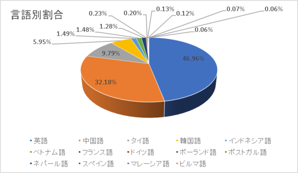言語の内訳を見ると、世界共通言語である英語は46.96%を占め、14言語中1位となりました。次に多かったのが中国語で32.18%。それに続くのが、タイ語(9.79%)と韓国語(5.95%)でした。