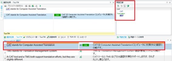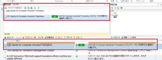 翻訳メモリ(TM:Translation Memory)は、過去の翻訳を1文ずつ、原文と訳文の対にしてデータベース化したものです。新しく翻訳を行う場合、翻訳メモリ内に再利用できるデータがあれば、ツール上に参考訳として表示されます。下図の例では、完全一致する原文がメモリにあることがわかります。