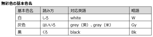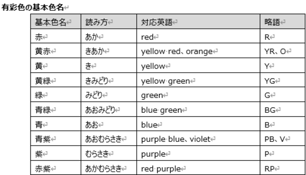 有彩色、無彩色、それぞれの基本色名は以下のとおりです。有彩色で10色、無彩色で3色が定められています。