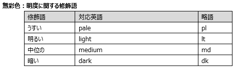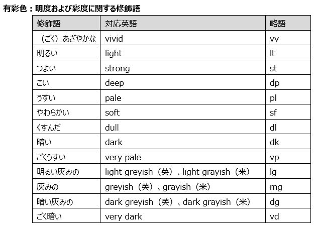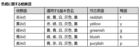 修飾語は、明度および彩度に関するものと色相に関するものがそれぞれ定められています。