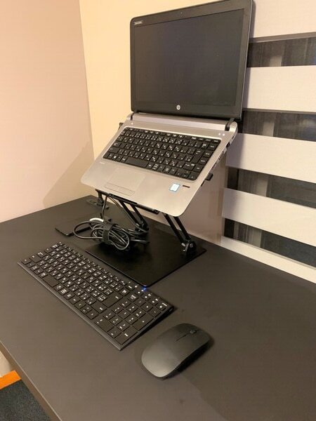 モニターは自分の目線の高さに上げましょう。ノートPCユーザーの方は特に注意です。ノートPCを直接デスクに置くとモニターを見下ろすことになります。そうすると、自然と猫背になってしまい、窮屈な姿勢での作業を強いられます。頭痛持ちかつ猫背の筆者にとって、このような姿勢は百害あって一利なしです。そこで、写真のようなスタンドを使ってモニターの位置を高くしています。自然と視線が上がり、猫背も改善されます。それに伴い、血行も良くなり頭痛などの症状も改善されます。