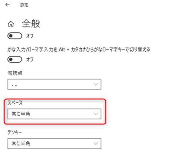 スタートメニュー → 設定 → 時刻と言語 → 言語 → [日本語] を選択して [オプション] をクリック → キーボードで [Microsoft IME] を選択して [オプション] をクリック → 全般 → スペースで [常に半角] を選択する。