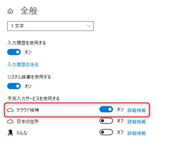 スタートメニュー → 設定→ 時刻と言語 → 言語 → [日本語] を選択して [オプション] をクリック → キーボードで [Microsoft IME] を選択して [オプション] をクリック → 全般 → 予測入力で [クラウド候補] をオンにする。