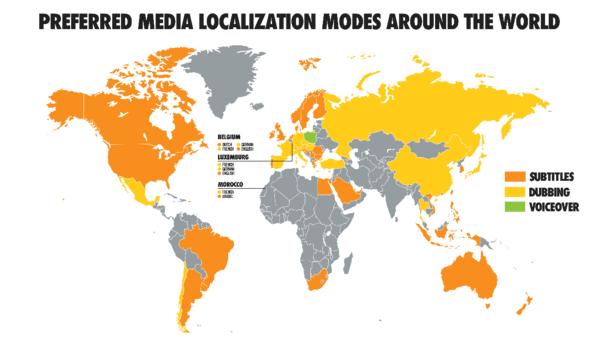 動画翻訳は、字幕、吹き替え、ボイスオーバーが主な方法となりますが、国や地域により好まれている方法が異なります。例えば北米地域は字幕が好まれるのに対し、東アジア地域は吹き替えが好まれる傾向にあります。(それぞれの方法の詳細については、弊社の関連ブログ「翻訳会社についての豆知識 ~よくある質問⑦マニュアル翻訳と動画翻訳~」をご覧ください。)