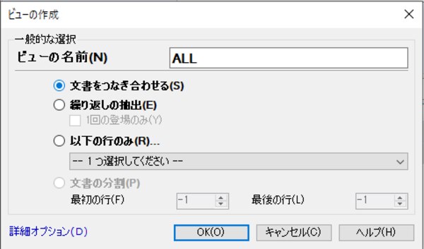 [ビューの作成]画面で、ビューに名前を付け、[文章をつなぎ合わせる]を選び、[OK]を押します。