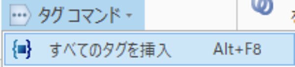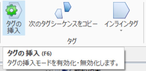 [編集]タブの[タグの挿入]をクリックすると、[タグの挿入モード]がONになります。ONになると、カーソルの右上にタグが表示され、クリックした位置に、原文と同じ順番でタグを挿入することができます。マウスの方がやり易いという方に、おすすめの方法です。