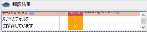 フラグメントマッチとは、セグメント単位で翻訳メモリのマッチは無いが、単語や文の一部など、フラグメント単位でマッチがある場合に表示されます。訳語の欄が空になっている結果については、オレンジ色の帯をクリックすると、コンコーダンスサーチ画面が開き、フラグメントマッチがあるエントリの一覧が表示されるようになっています。