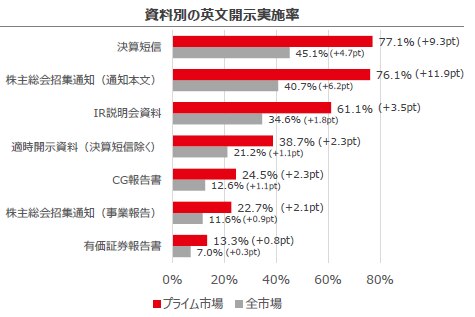 IR関連文書の中でも、最も英文開示されているのが決算短信です。他の文書に比べるとボリュームが少なく、翻訳しやすいことも一因かもしれませんが、海外投資家向けの情報発信の手段として重視されているのが分かります。決算短信は速報としての意味合いが強いため、日本語版も英語版も特に迅速な開示が求められます。最近では和英同時開示をしている企業も増えてきています。
