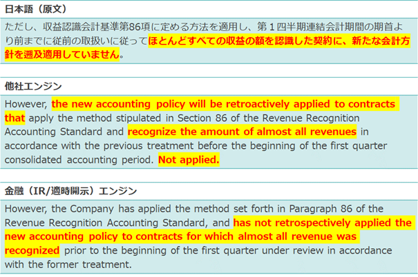 百聞は一見に如かず。「金融(IR/適時開示)エンジン」と他社のエンジンとで、訳出結果にどのような違いが出るのかご紹介します。以下は決算短信の一部抜粋を両エンジンで英訳した場合の比較結果です。赤文字と黄色ハイライトの箇所にご注目ください。