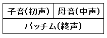 文字を構成する最初の子音を初声、母音を中声、最後の子音を終声またはパッチムと呼びます。下図では初声と中声が左右に並んでいますが、上下に並ぶ文字、下から右にかけて並ぶ文字もあります。パッチムがある文字の場合は初声と中声の下に配置されます。