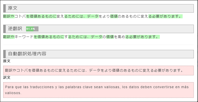 ハイライトの箇所が原文・逆翻訳文に共通した表現であることを示しており、数が多いほど、原文とのマッチ率が上昇していきます。例に挙げた文のマッチ率は61.5%とそこまで高くないように見えるかもしれません。これは、原文の表現と全く同じものが使われないとマッチ率が下がってしまうことが原因です。したがって、原文とのマッチ率が低い逆翻訳文=不十分な翻訳とは必ずしも言い切れないため、逆翻訳文の内容を丁寧に確認することが重要です。