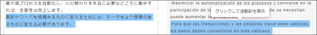 以下はある文書の一部を日本語からスペイン語に翻訳し、さらにそれを日本語に逆翻訳した例です。訳文にカーソルを合わせると原文で対応している箇所がハイライトされます。そのまま訳文をクリックすると、逆翻訳結果を表示することができます。(※逆翻訳は「テキスト翻訳」でのみ利用できる機能です)