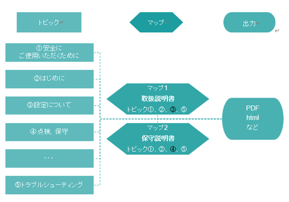 トピックごとにファイルが分かれているため、目的に応じてマップを作成すれば、トピックファイルを取捨選択し、目的の異なるドキュメントを簡単に作成することができます。同じトピックを異なるマップで使用することにより、同じコンテンツが簡単に再利用も更新もできるのです。たとえば、同じ製品の取扱説明書と保守説明書を作成するとします。この場合、それぞれのマップを作成すれば、導入部分のトピックは両方のマップで再利用しつつ、ユーザー向けの設定に関するトピックは取扱説明書のマップにのみ含め、保守担当者向けの点検手順のトピックは保守説明書のマップにのみ含めることができます。あるいは、機械の機種ごとにマップを作成すれば、全機種で共通しているコンテンツを簡単に再利用できます