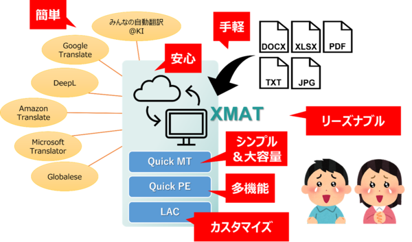そこで役立つのが「AI翻訳活用プラットフォーム XMAT」です。A4用紙1枚のお知らせからマニュアルまで、社内のパソコンで簡単に文書の翻訳が可能です。最終的な確認は人の目が必要ですが、一から翻訳を外注する必要はなく、文書に修正が入っても何度でも翻訳できます。