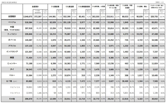 どれくらいのベトナム人が技能実習生として来日しているのでしょうか。厚生労働省のデータによれば、外国人労働者の国籍別ではベトナムが最も多くなっています。そしてベトナム国籍の方の在留資格別では技能実習、就業先の産業別では製造業が最も多くなっています1。