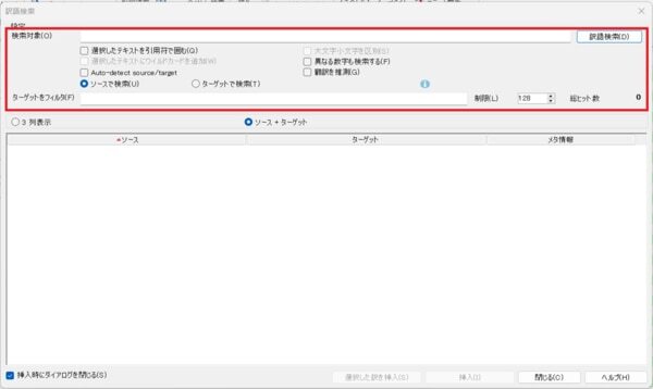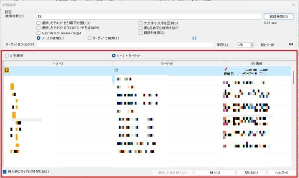検索結果の表示形式は[3列表示]または[ソース+ターゲット]のいずれかを選択できます。今回はデフォルトの設定である[ソース+ターゲット]で結果を表示する場合について解説します。