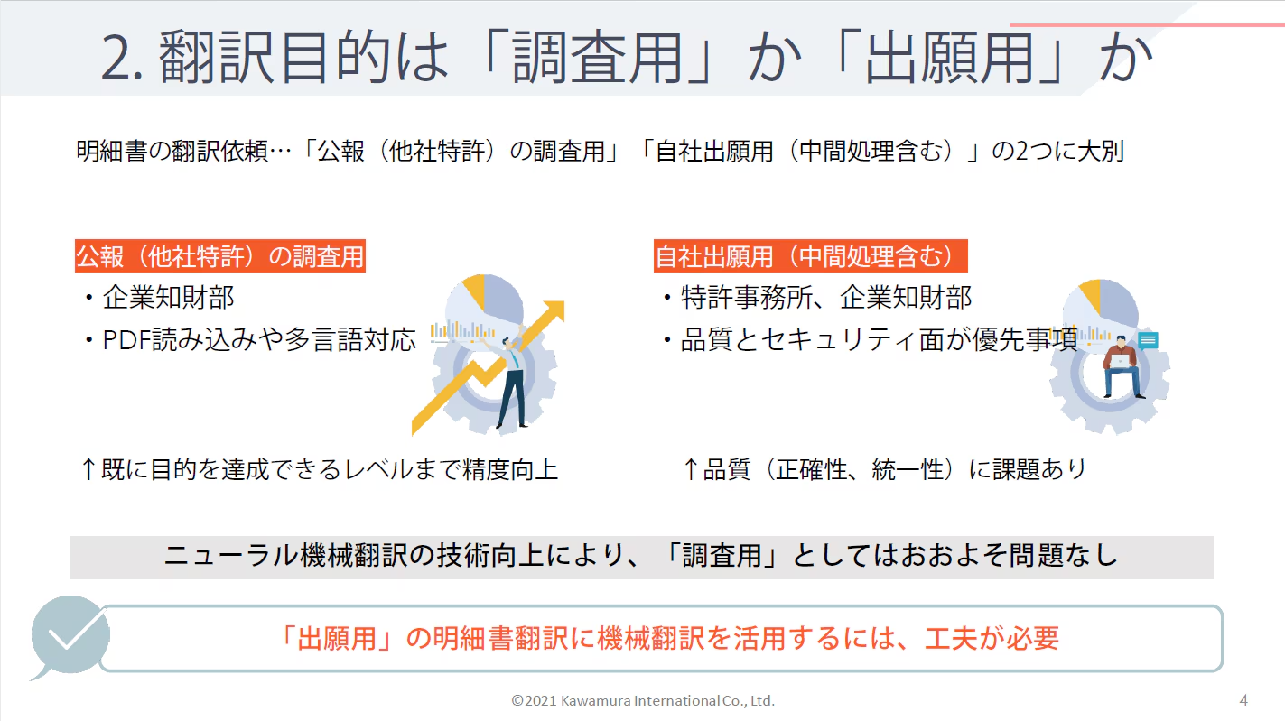 特許分野の翻訳において、機械翻訳の導入・活用が注目を集めています。しかし、特許文書特有の専門用語や長文を機械翻訳にかけ、訳文の品質基準を満たすにはちょっとした工夫が必要です。
