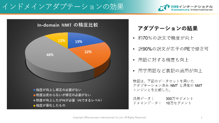 また、インドメインアダプテーションは10万行程度の対訳データがあれば実施することが可能なため、対訳データが足りなくて機械翻訳エンジンを活用できなかったという方々にも、使いやすくなっています。