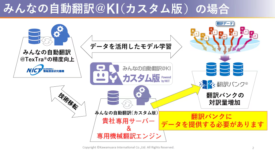 みんなの自動翻訳@KI(カスタム版)は、国立研究開発法人情報通信研究機構 (NICT) が開発したメイド・イン・ジャパンの自動翻訳エンジンを活用し、自社向けにカスタマイズしたエンジンです。御社のためだけに特別にカスタマイズしたエンジンですので、アクセスできるのも御社に限定されています。